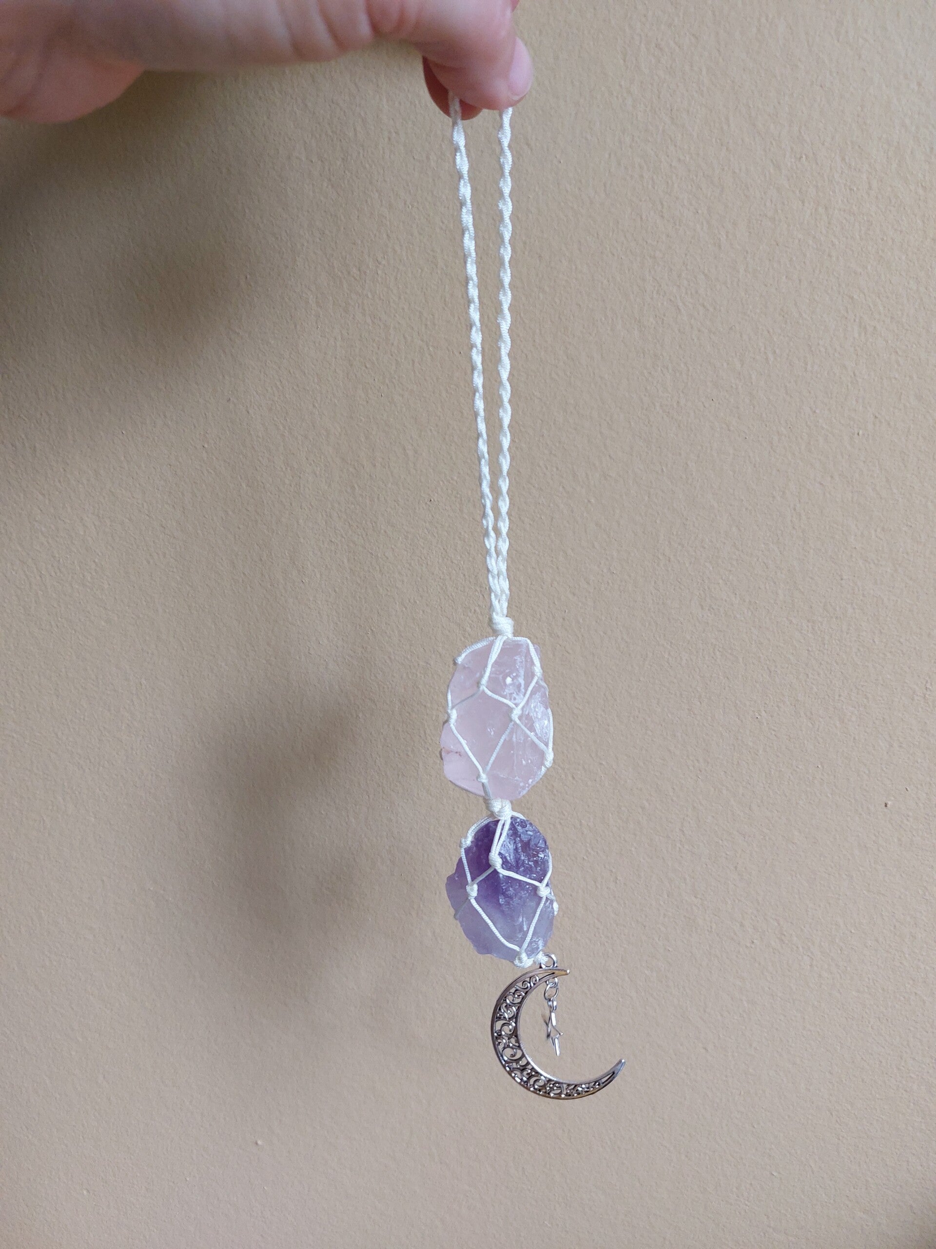 Liefdevol, zo zou ik deze hanger omschrijven. De prachtige combinatie met de zachte roze kleur van rozenkwarts in combinatie met de spirituele paarse tint van amethist maken deze handgemaakte macraméhanger een sieraad voor je huis. De zilverkleurige bedel van de maan en een ster maken deze ook perfect voor de slaapkamer of kinderkamer.
